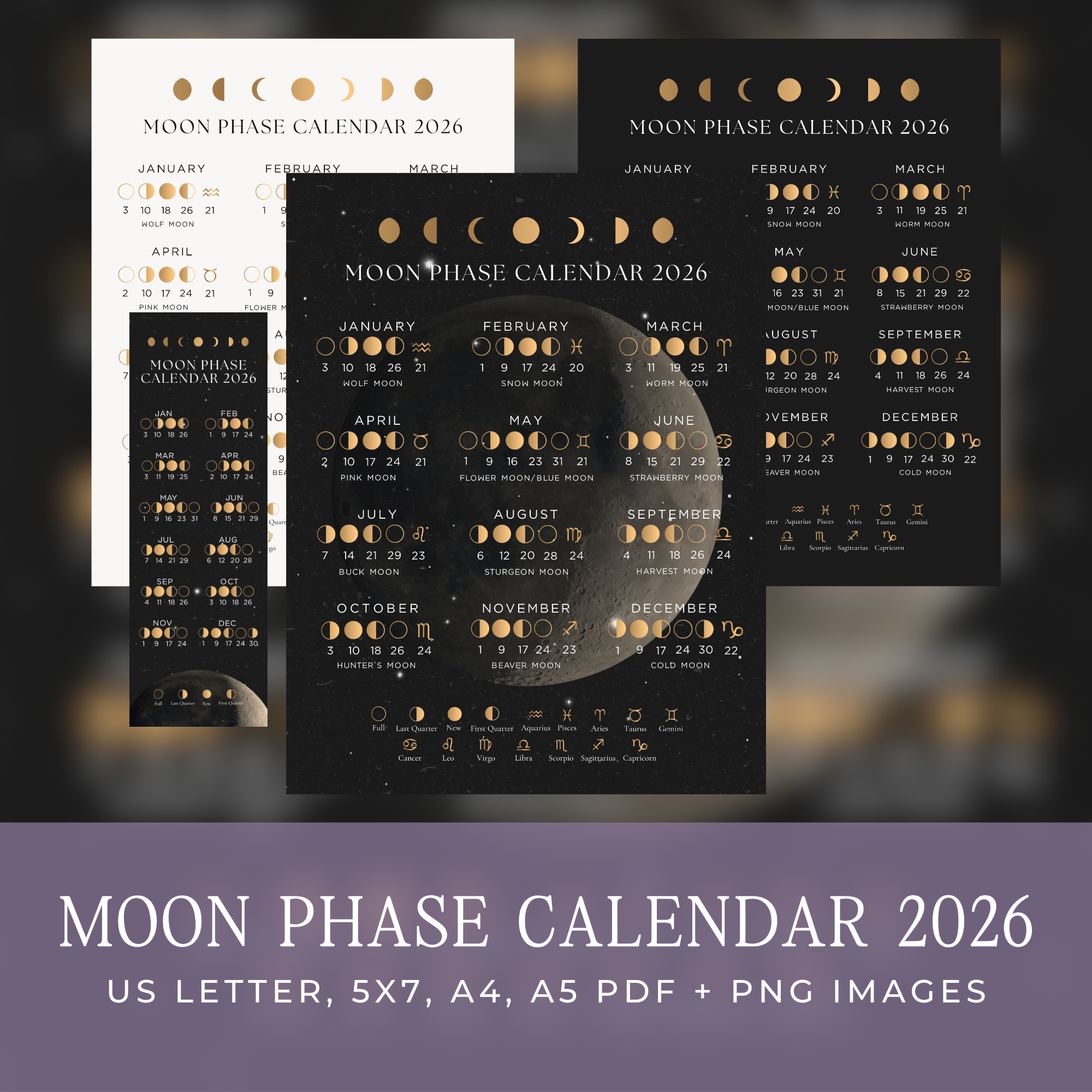 Keep track of the moon phase dates in 2026 with this Coordinated Universal Time lunar calendar. It contains the following moon phases and zodiac sign for each month.